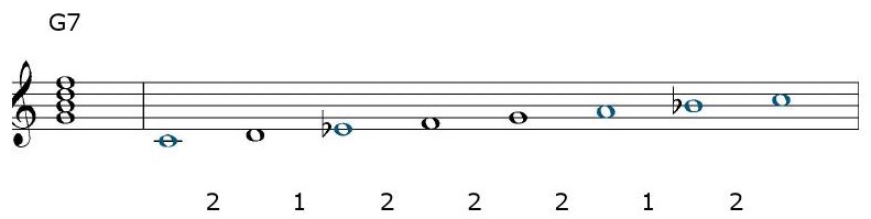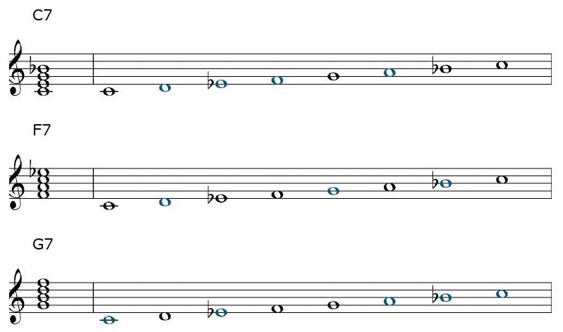 これら3つのコードのコードトーンを黒、それ以外を青にそれぞれ色分けします